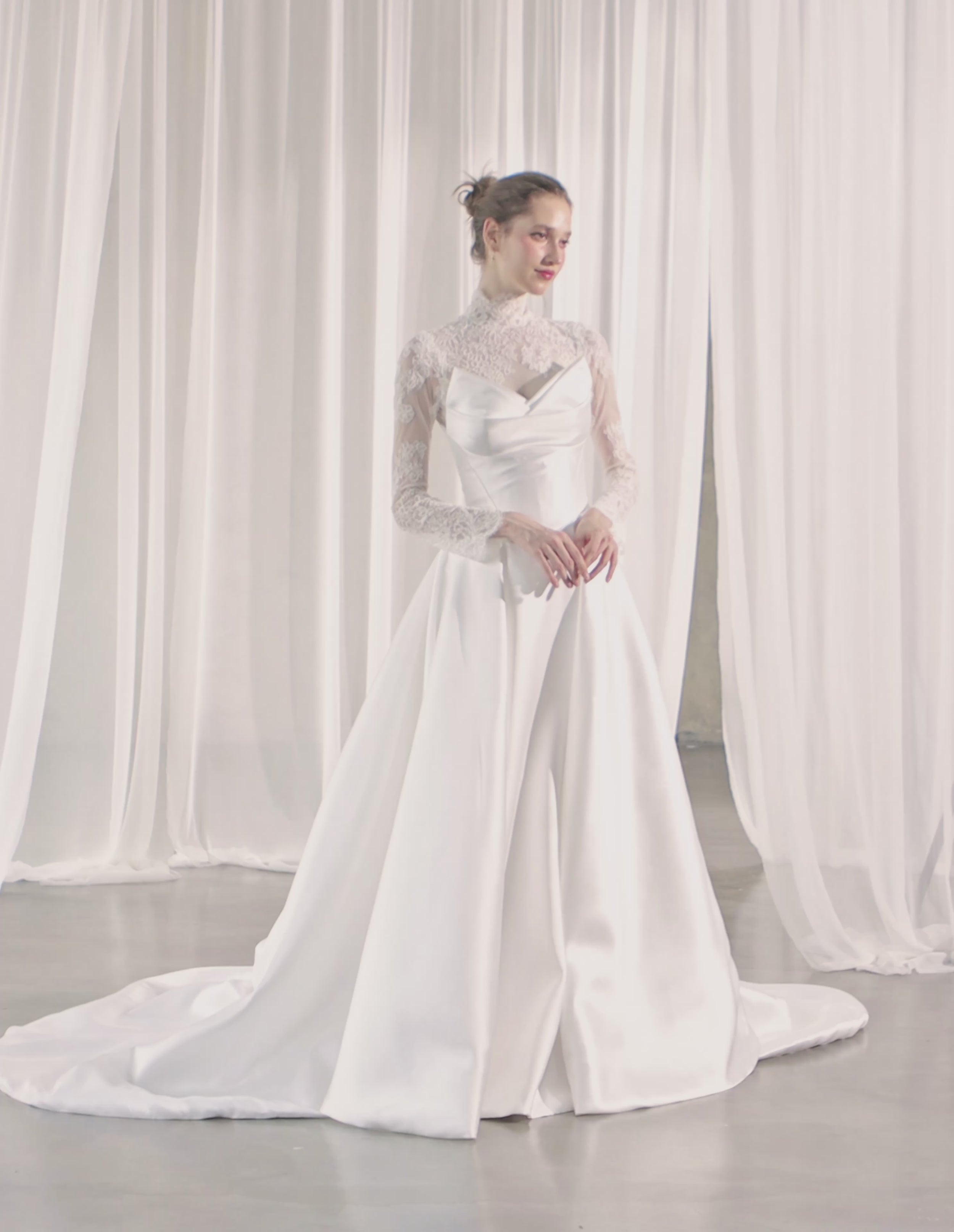 Dieses elegante Brautkleid aus luxuriösem Mikado Satin besticht durch seine klare A-Linien-Silhouette und ein edles, modernes Design. Der dezente Sweetheart-Ausschnitt betont das Dekolleté, während der fließende Rock mit Schleppe für eine majestätische Ausstrahlung sorgt. Ergänzt wird der Look durch einen feinen Spitzen-Schleier, der dem Auftritt eine romantische und klassische Note verleiht.