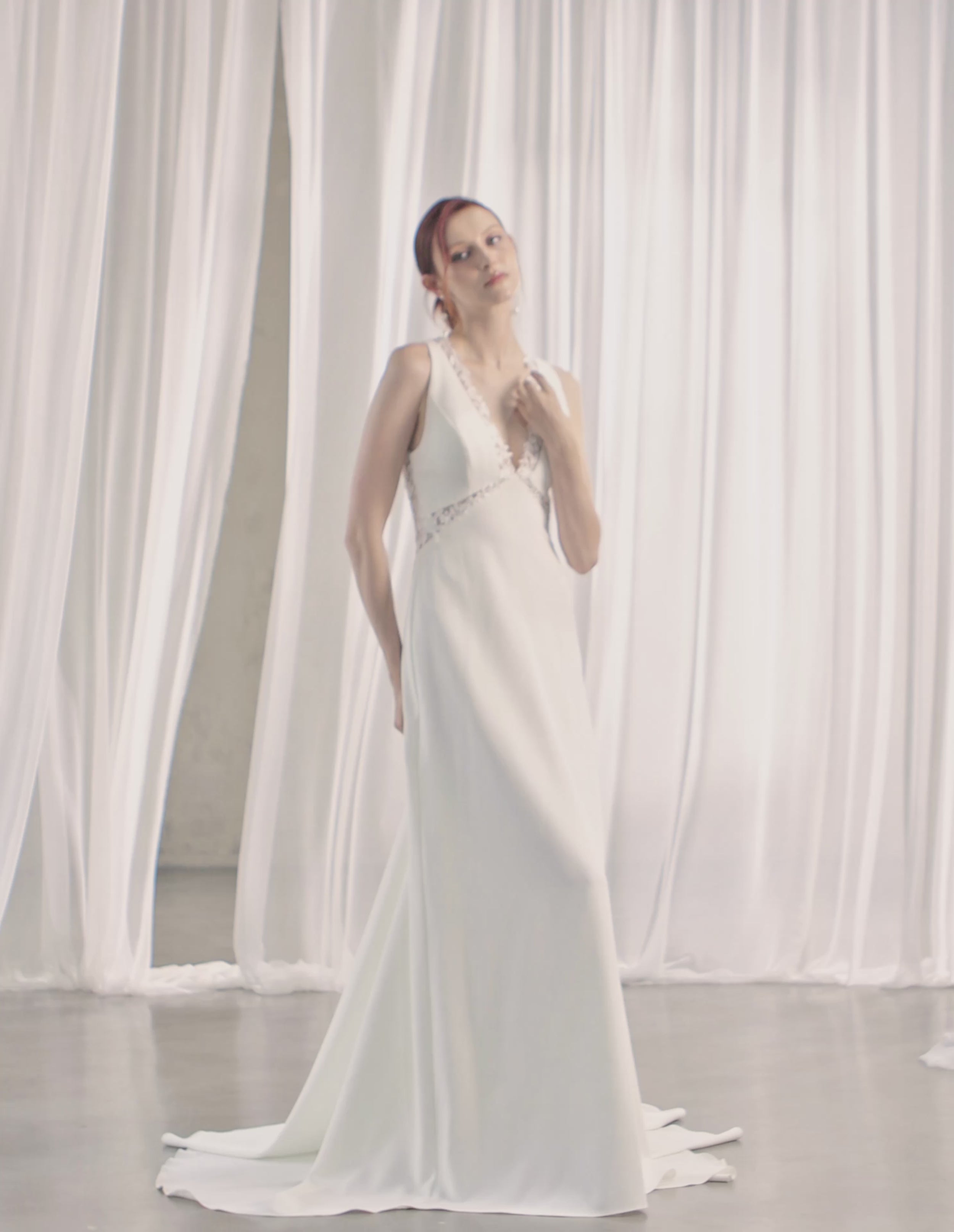 Cette robe de mariée moderne et élégante, confectionnée en satin brillant luxueux, présente une silhouette en ligne A intemporelle. Le décolleté en V, bordé de fine dentelle, sublime le buste avec raffinement. À l’arrière, un dos nu sensuel attire le regard, tandis que de délicates fleurs finement travaillées ajoutent une touche féminine. La longue traîne ornée complète la création et lui confère une allure majestueuse au charme fluide et romantique.