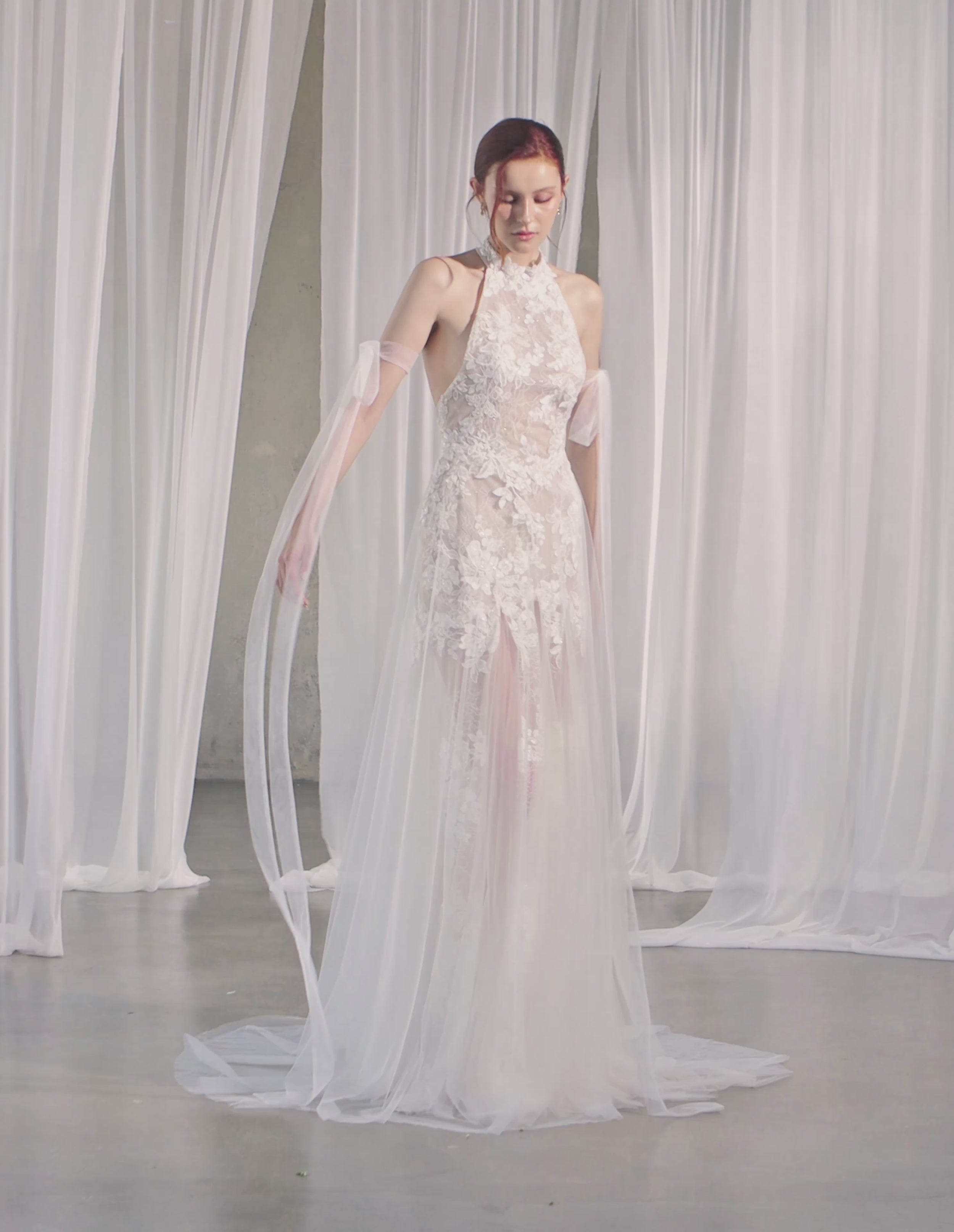 Cette robe de mariée à col halterneck séduit par son travail artisanal raffiné et son charme romantique et moderne. Le corsage est orné de fleurs en dentelle façonnées à la main, délicatement appliquées pour créer une structure sculpturale. De fines broderies parcourent la dentelle et dissimulent une inscription secrète avec les initiales du couple et la date du mariage – un détail très personnel intégré dans le design. Des ornements floraux supplémentaires et des éléments brodés à la main soulignent le savoir-faire exceptionnel et l’amour du détail.
