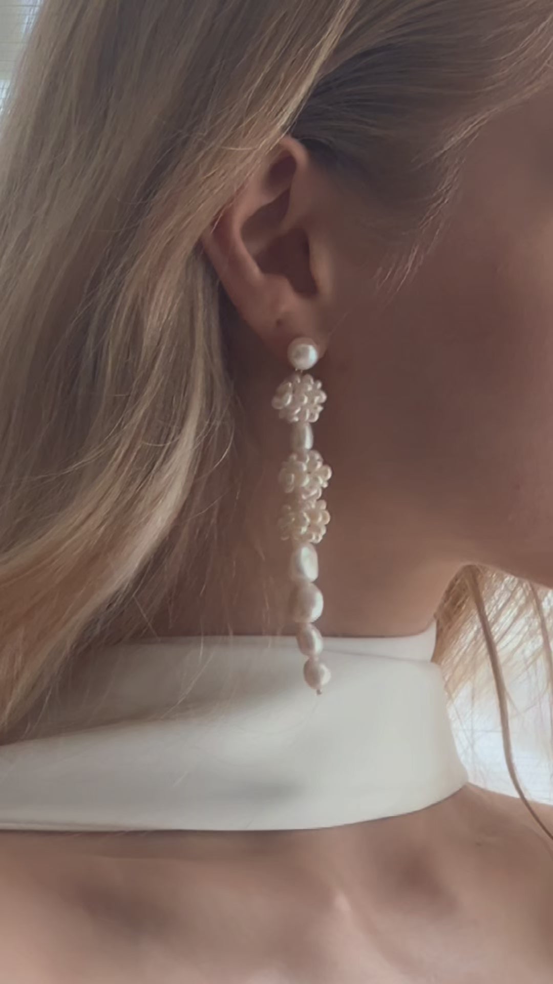 Diese einzigartigen Ohrringe vereinen natürliche Eleganz mit modernem Design. Von einem einzelnen runden Perlenstecker ausgehend, reihen sich kunstvoll gearbeitete Perlen-Cluster in Blütenform mit glatten, barocken Süßwasserperlen abwechselnd aneinander. Das Ergebnis ist ein femininer, verspielter und zugleich luxuriöser Look.
